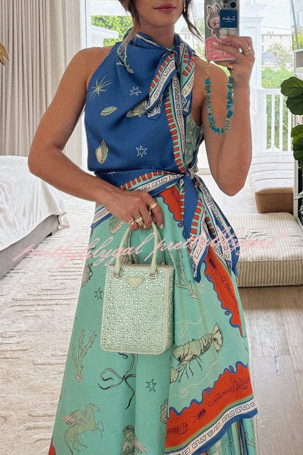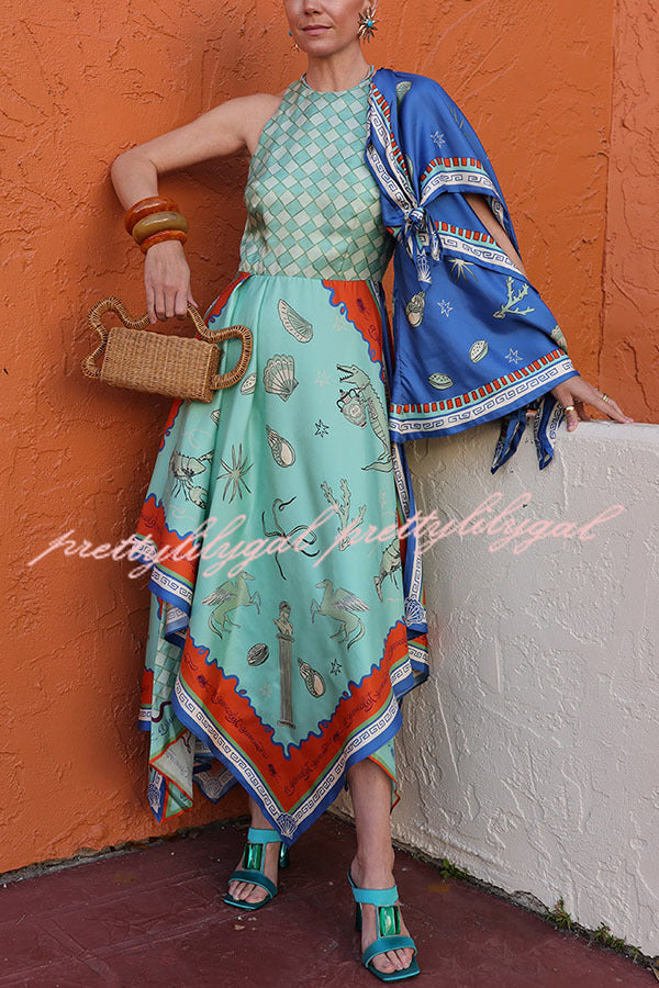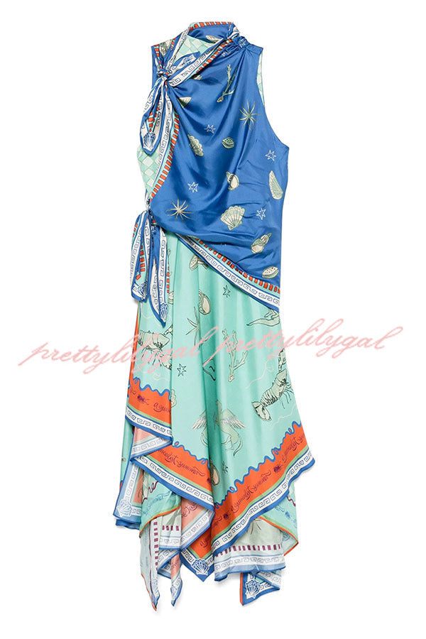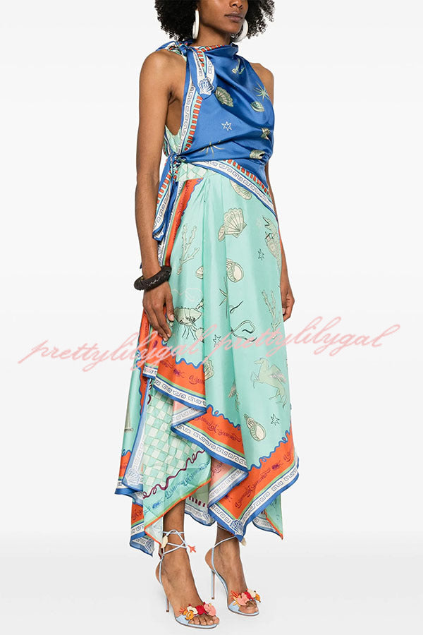 Surrealist Summer Satin Unique Print Tie-up Details Layered Hem Scarf Maxi Dress