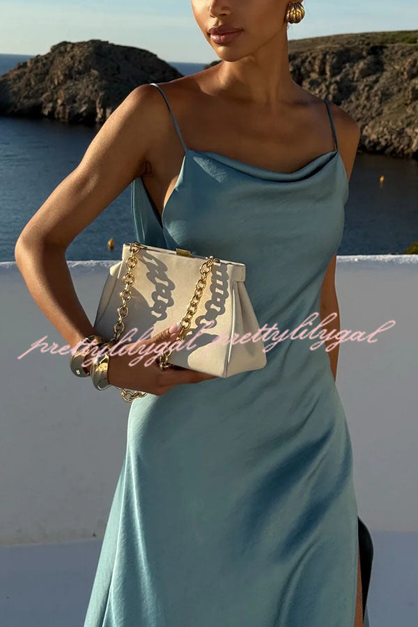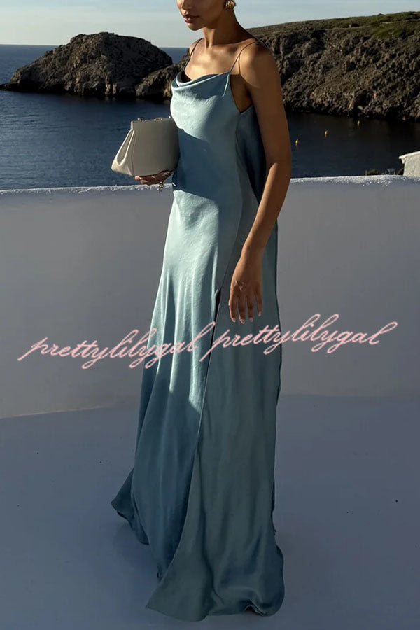 Flowing Elegance Satin Draped Neck Backless Ruffle Slit Maxi Dress