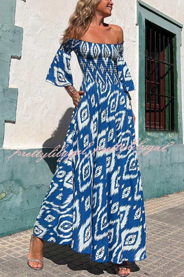 Close To The Vacation Ethnic Print Smocked Off Shoulder Pocketed Maxi Dress