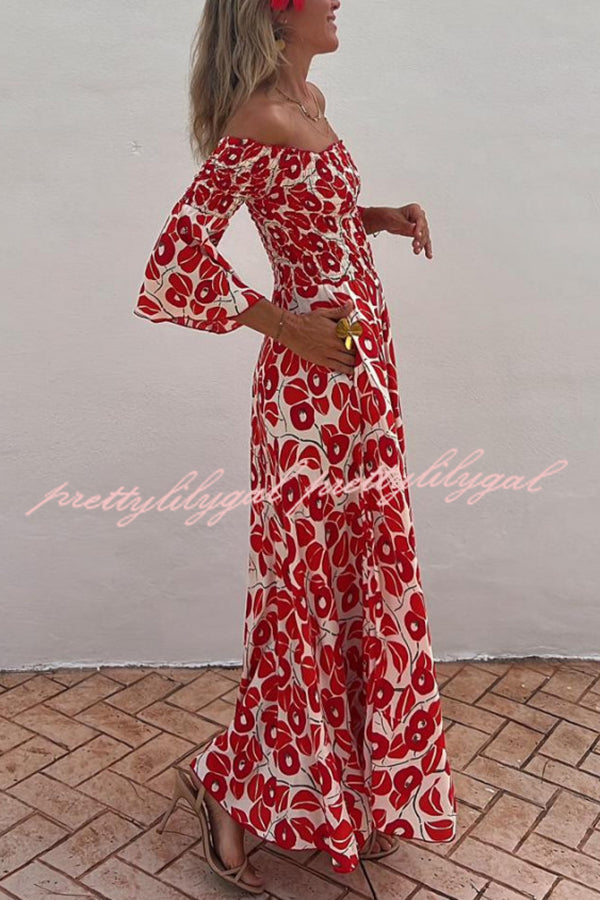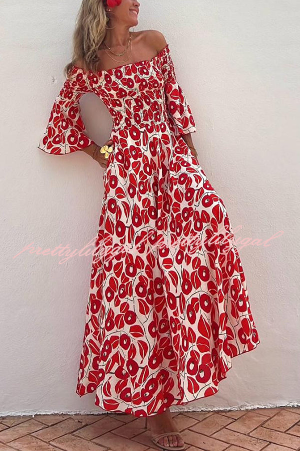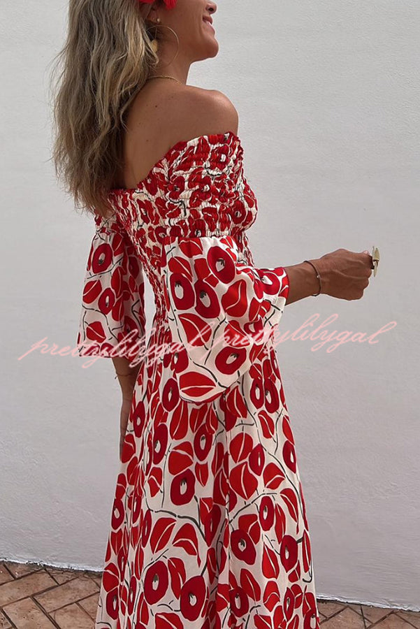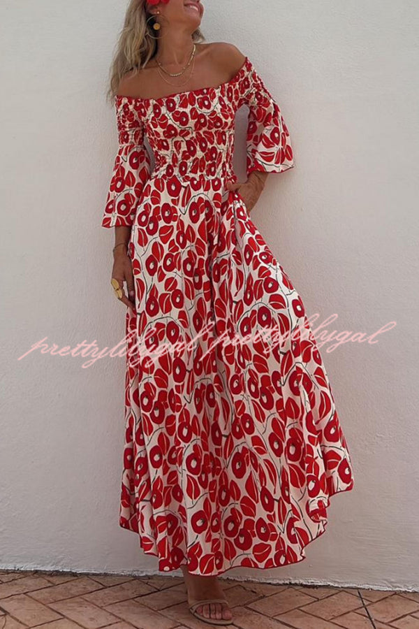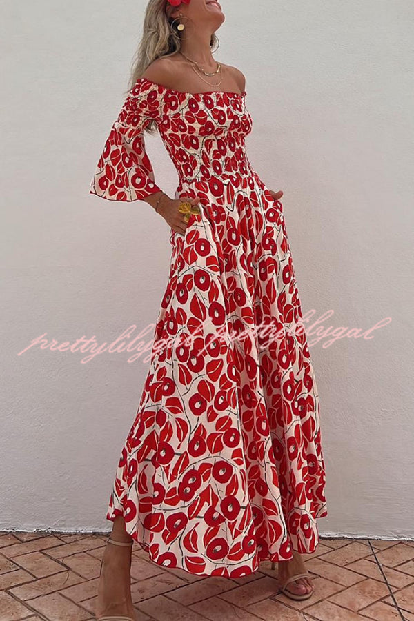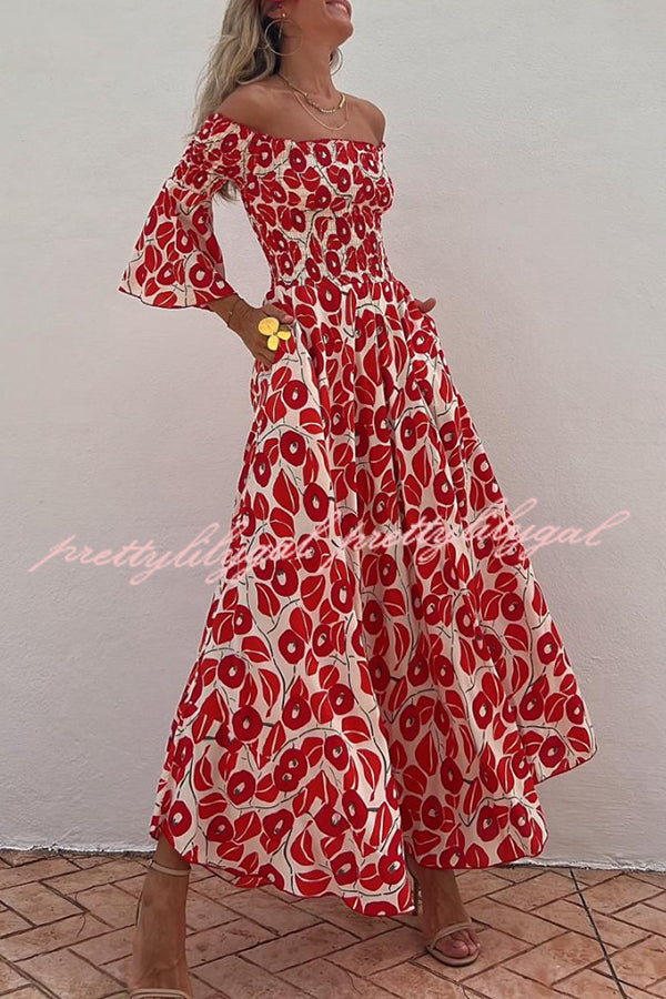 Close To The Vacation Floral Print Smocked Off Shoulder Pocketed Maxi Dress